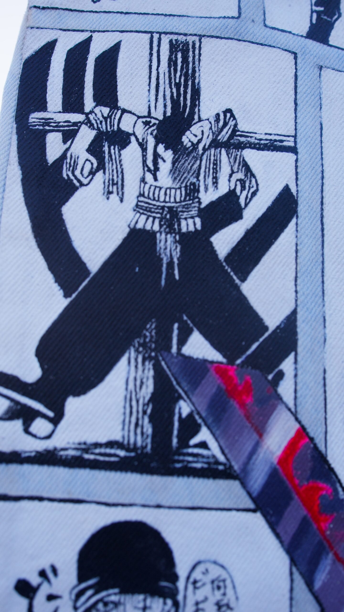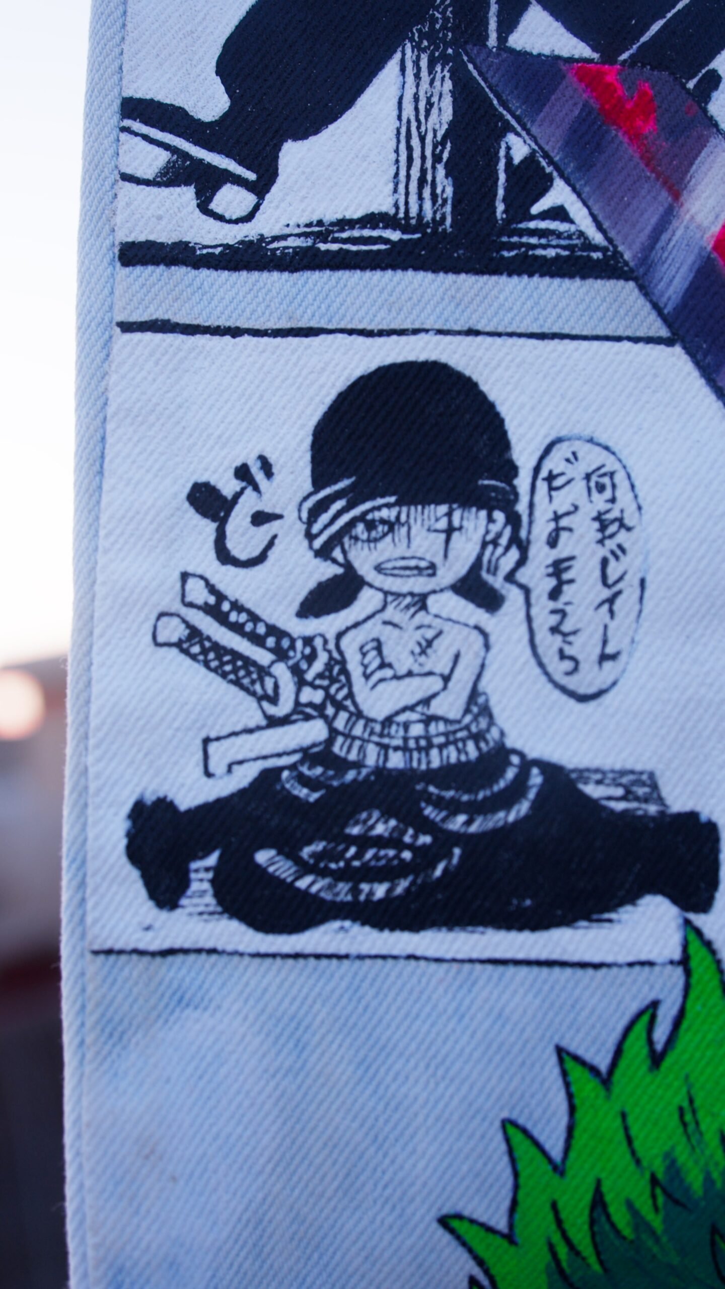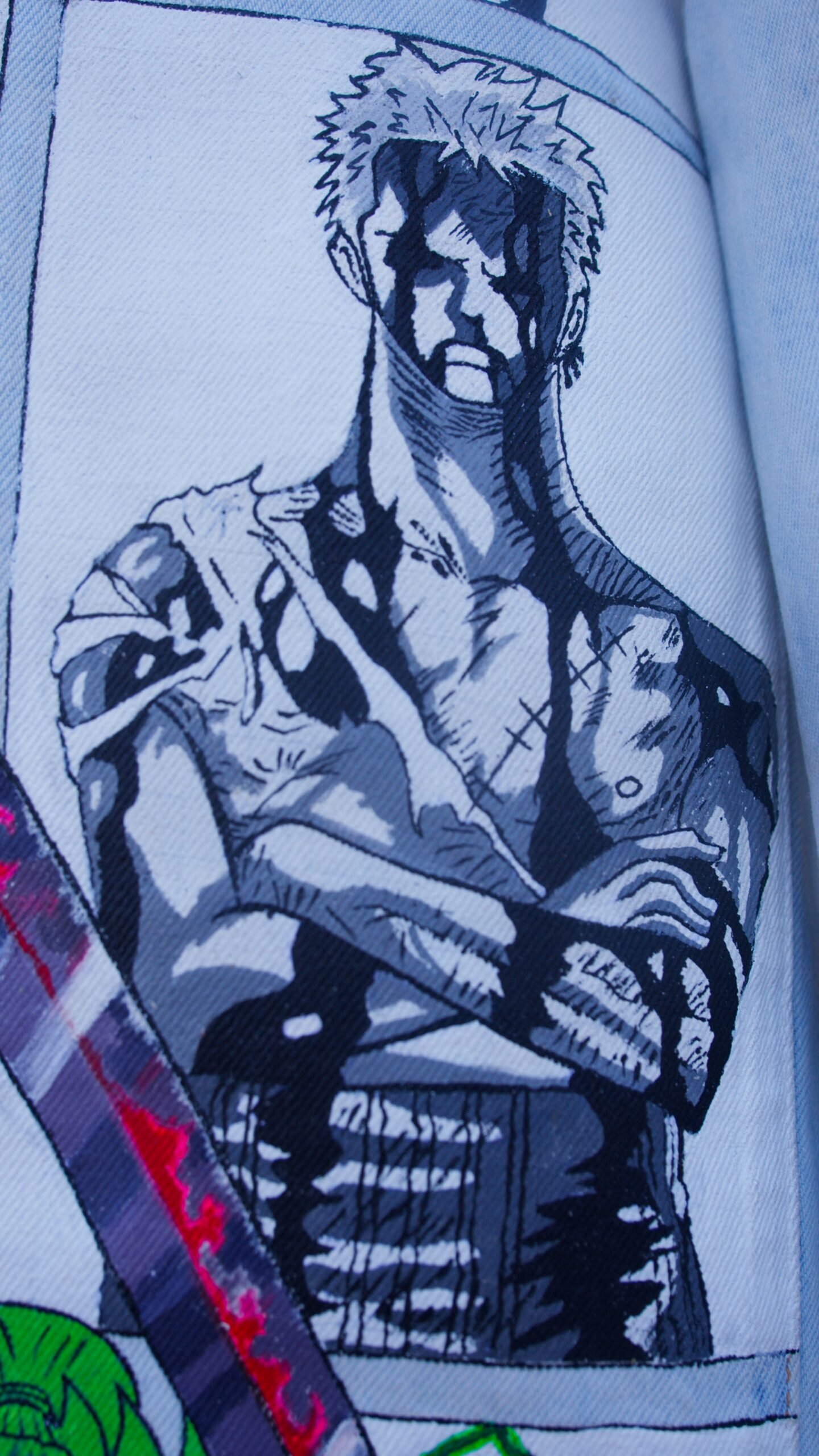 Discover an exceptional denim piece adorned with intricate manga illustrations and a vibrant anime design.